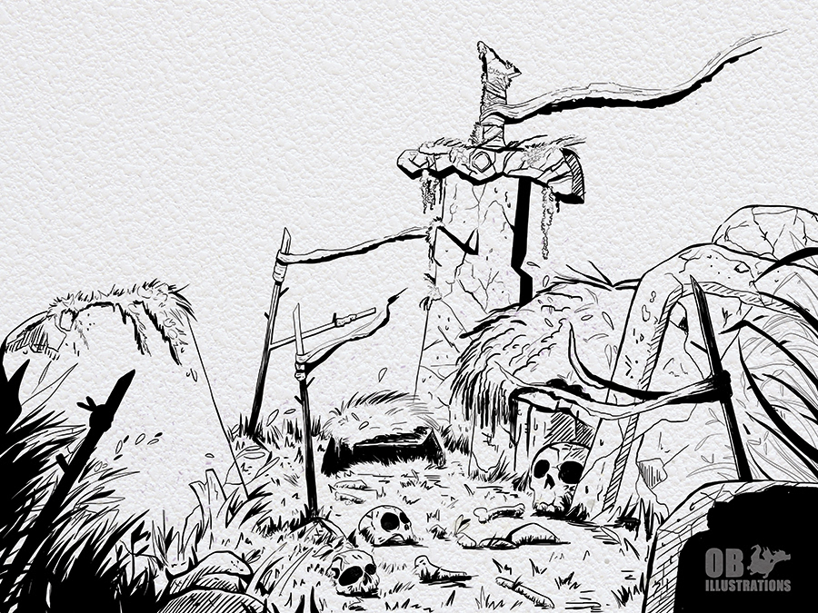 L’atmosphère oscille entre grandeur et abandon : la lumière éclaire la scène d’une douceur trompeuse, contrastant avec les crânes blanchis et l’ombre des ruines lointaines. C’est un monde où la victoire s’est éteinte depuis longtemps, mais où l’écho des légendes continue de vibrer dans la pierre.